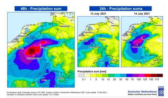在 24 小时内,降雨量为 100 - 150 L/m2。这一数字超过了 2010 年 7 月整个月的典型总降雨量。至少有 240 人在洪水中丧生,仅德国的经济损失就高达 45 - 55 亿欧元。
