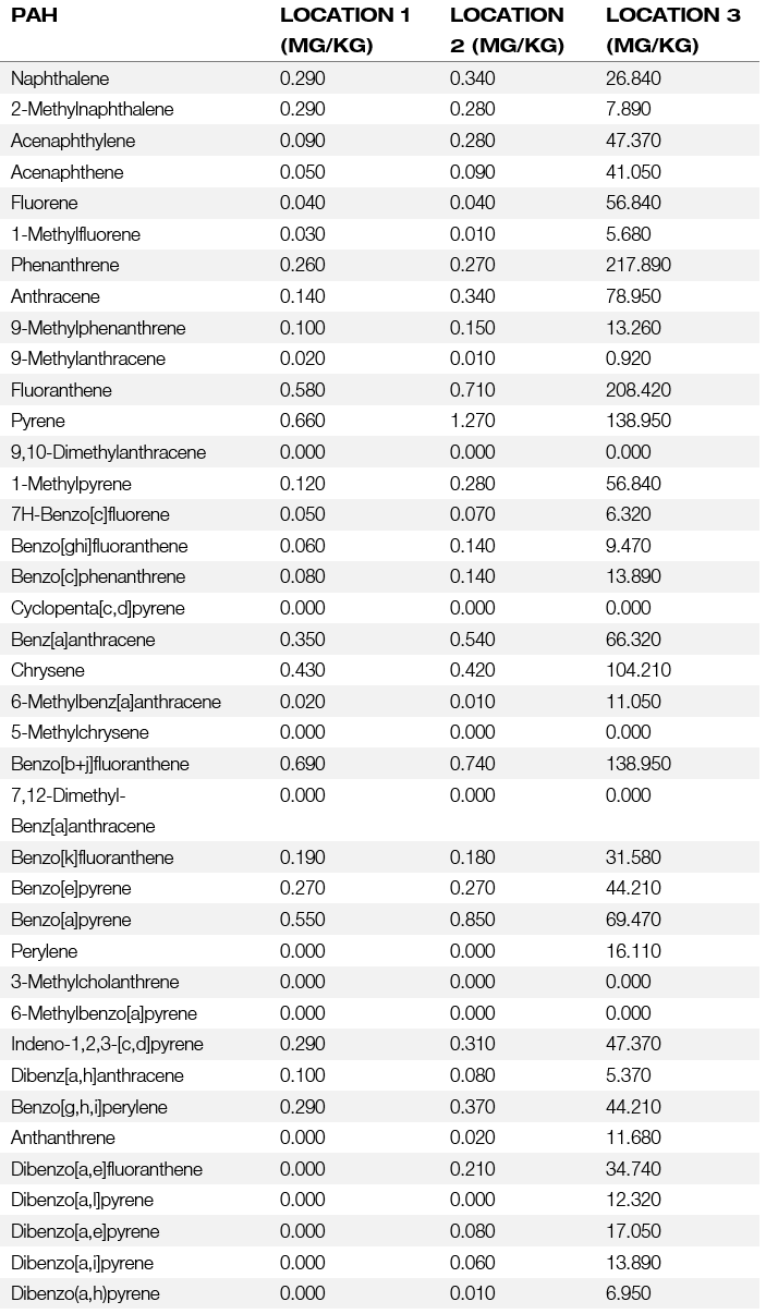 ▲ 图2:淹水后三个不同位置的 mg/kg 沉积物中多环芳烃含量。