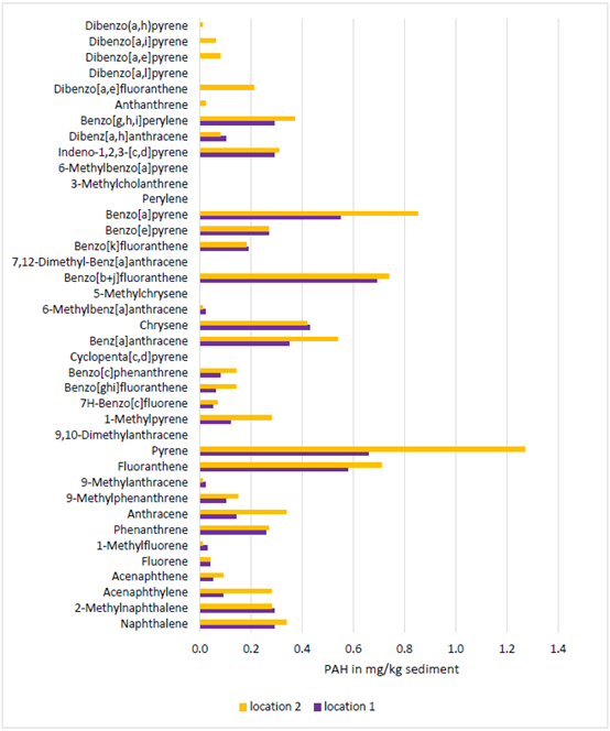 图2 显示了从三个不同地点采集样本的多环芳烃测定结果。3号地点污染程度较高;因此,为了更好地进行比较,图3 只显示了位置 1 和位置 2 的结果。