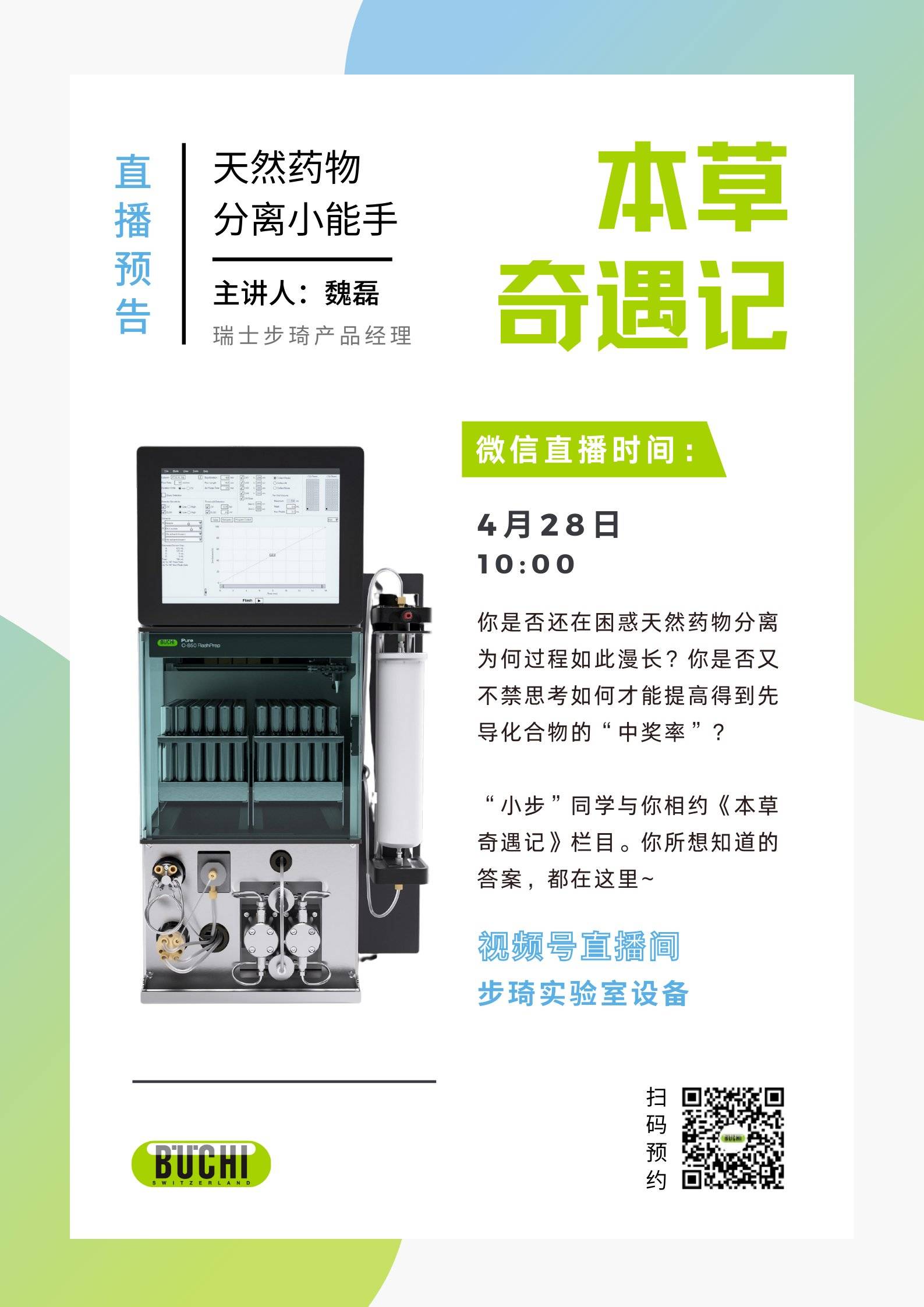 你是否还在困惑天然药物分离为何过程如此漫长?你是否又不禁思考如何才能提高得到先导化合物的“中奖率”?“小步”同学与你相约《本草奇遇记》栏目。你所想知道的答案,都在这里~4月28日 10:00步琦视频号直播间等你!