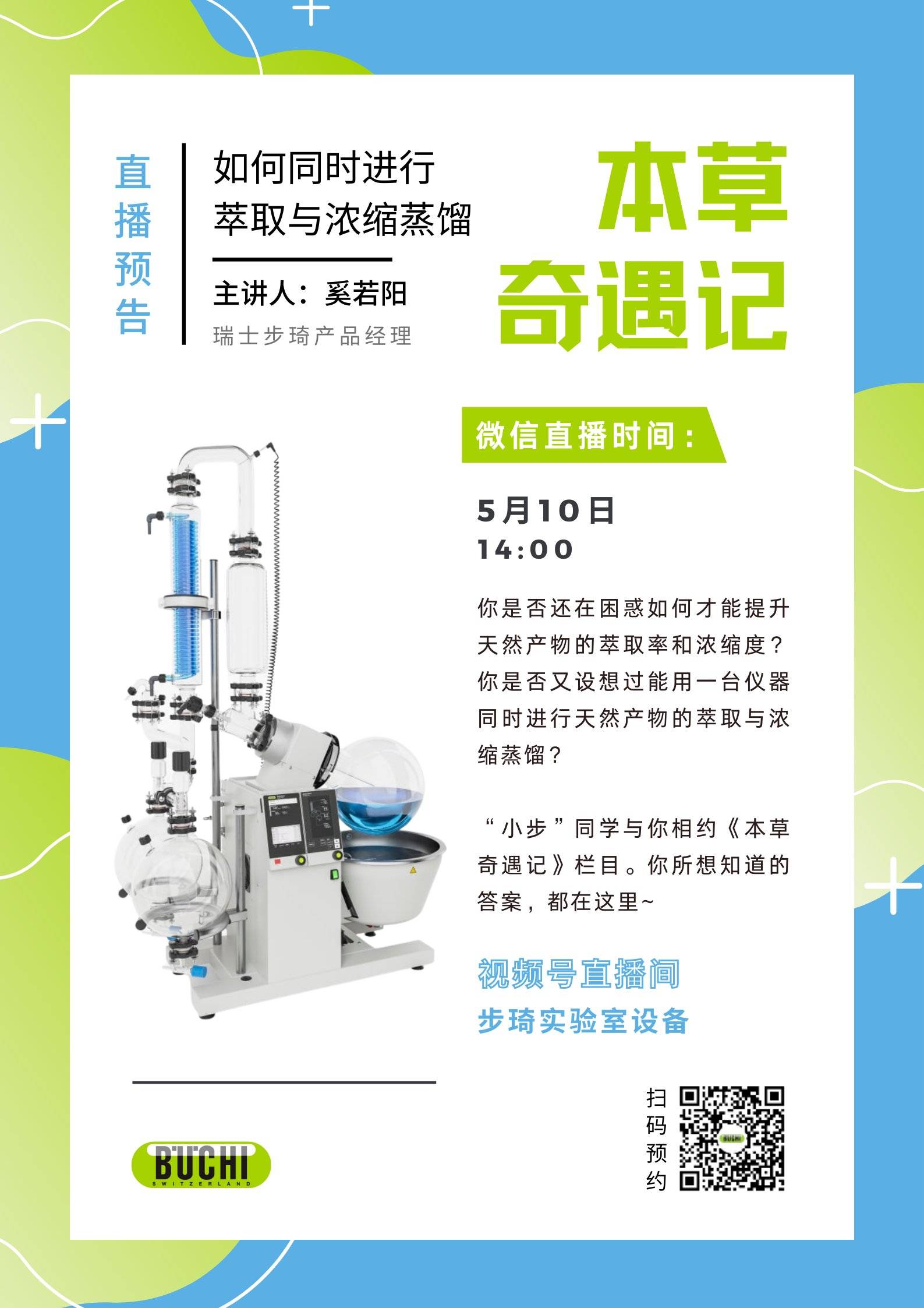 你是否还在困惑如何才能提升天然产物的萃取率和浓缩速度?是否又设想过用同一台仪器进行天然产物萃取与浓缩蒸馏?相约《本草奇遇记》栏目,你所想知道的答案,都在这里~5月10日 14:00步琦视频号直播间等你!