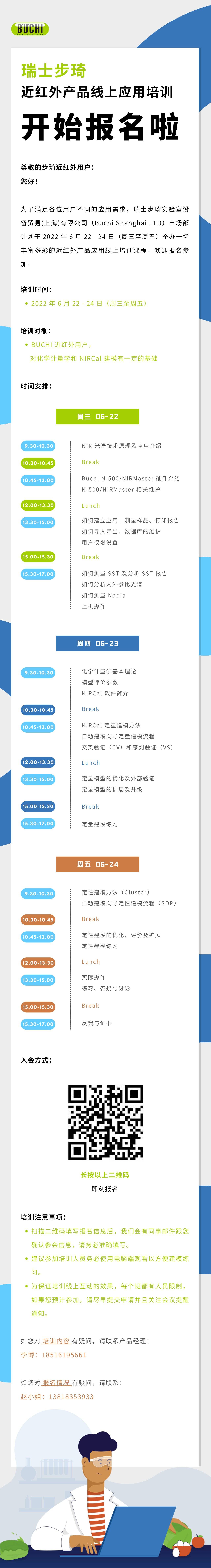 瑞士步琦近红外产品线上应用培训班通知 尊敬的步琦近红外用户:您好!为了满足各位用户不同的应用需求,瑞士步琦实验室设备贸易(上海)有限公司(Buchi Shanghai LTD)市场部计划于 2022 年 6 月 22 - 24 日(周三至周五)举办一场丰富多彩的近红外产品应用线上培训课程,欢迎报名参