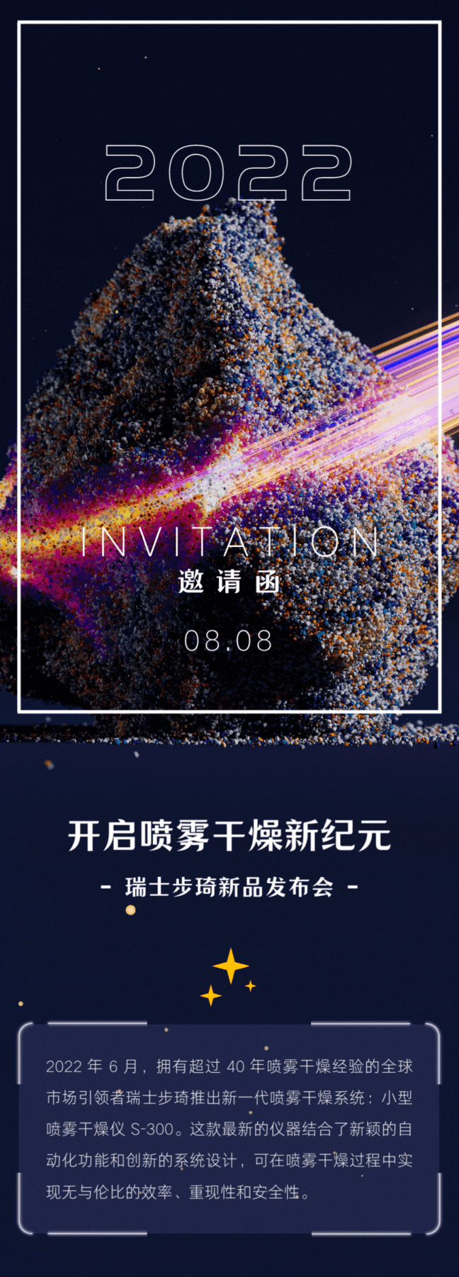 2022年 8月8日 步琦将携手粉体网进行全新小型喷雾干燥仪 S-300 网络直播发布会,欢迎您前来了解更多产品信息。此次发布的小型喷雾干燥仪 S-300 将颠覆您对常规喷雾干燥实验的认识。更多惊喜,在直播发布会中等着您!