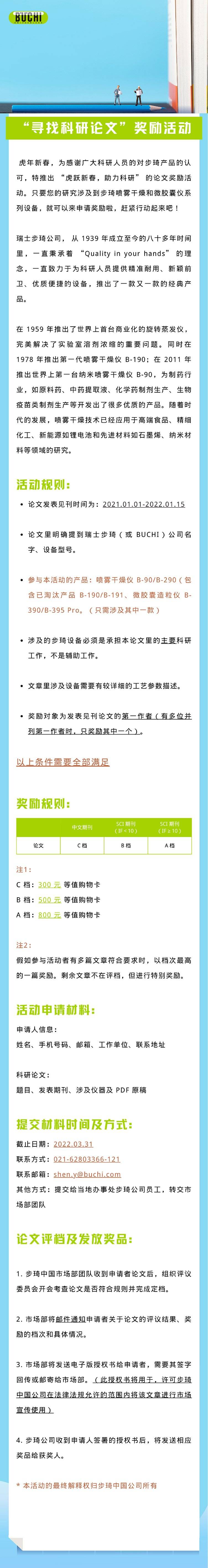 活动内容虎年将至,为感谢广大科研人员的对步琦产品的认可,特推出 “虎跃新春,助力科研” 的论文奖励活动。只要您的研究涉及到步琦喷雾干燥和微胶囊仪系列设备,就可以来申请奖励啦,赶紧行动起来吧!瑞士步琦公司, 从 1939 年成立至今的八十多年时间里,一直秉承着 “Quality in your han