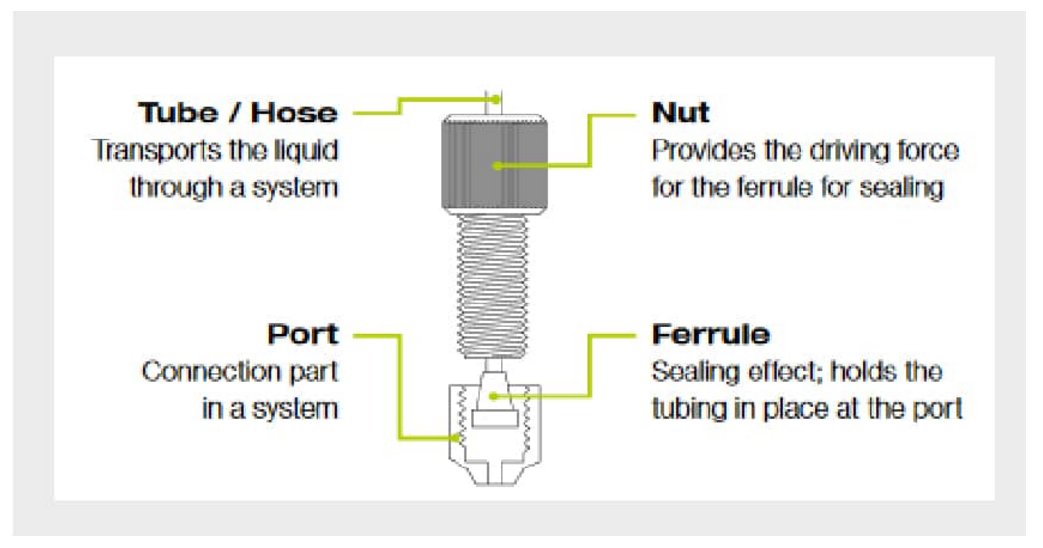 很少有人注意到,在一套色谱装置的内部有一个非常精致的色谱系统部件网络。我们希望能通过这篇文章,带大家了解中压和高压制备色谱的接头、管线和接口这三个部分,以及如何最好地安装和使用它们。 1色谱系统部件:接头常规的色谱接头看起来如下图所示:图示:色谱接头一览接头的设计可以是一体式的,即螺母和卡套结合在一