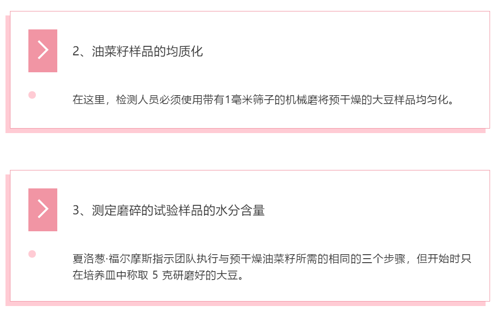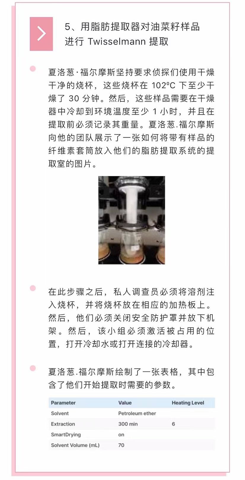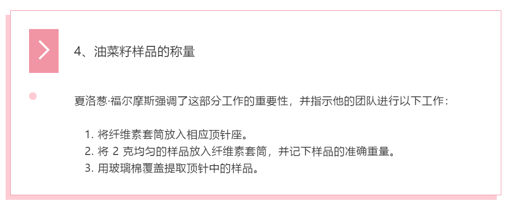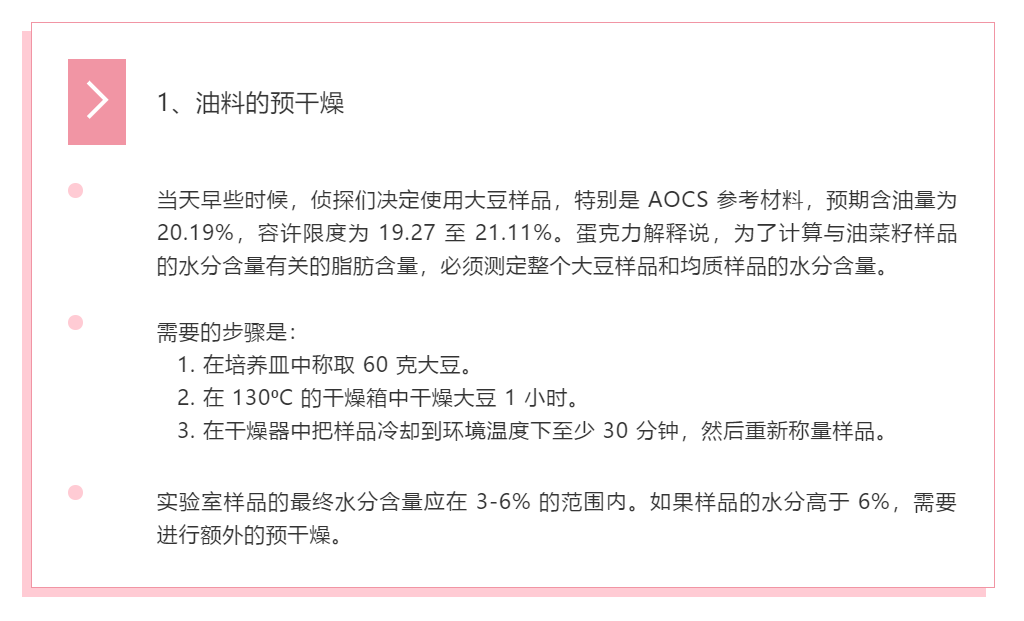 夏洛葱·福尔摩斯提出,他们通过标准方法 AOCS Ac 3-44 的步骤,侦探们将使用该方法进行实验,以满足合规性要求。侦探们讨论了每一个步骤,以优化油菜籽中油的测定过程。