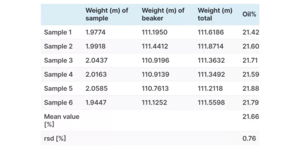 他们一起看了他们的结果,并注意到数据与预期值非常吻合,相对标准偏差很低(预期含油量:20.19%,容许极限为19.27-21.11%)。