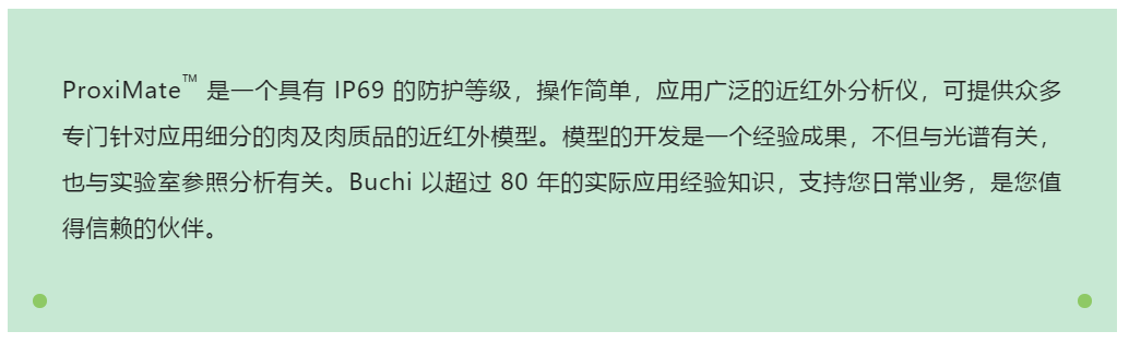 测量可以用 ProxiMate™ 的上照或者下照模式来完成。标配的培氏培养皿和耐摔杯,大样品杯满足大多数要求,而高性能样品杯和不碎样品杯满足某些要求最大精确度和准确性的情况。 近红外模型: 一个可靠的近红外模型应该包括蕴含不同变化的样品。我们的数据库中包含了数以千计的光谱,涵盖了地域和季节的变化。 参考方法: 步琦拥有许多实验室产品,它们提供近红外模型参考值所必要的官方方法和被认可的分析:比如,加热炉提供固体水分值,索氏提取测量脂肪含量,凯氏定氮测量蛋白质含量。 服务和支持: 近红外光谱是一个带有生命的业务。她的模型应该被定制化,以达到可能的最好结果。无论您想使用我们预定标模型的“即插即用”方案,还是您想用我们优秀的化学计量学自动建模软件,只需要输入三个样品的参考值就会自动校准,更大方便了客户自己建立或者更新数据库的便捷性,我们的应用专员将给您服务到家的支持。 BUCHI Flux Console 实现最大化功能性的联网: 借助云服务控制中心 Flux Console 充分发挥近红外 ProxiMate™ 仪器的潜能。通过将近红外 ProxiMate™ 与云服务控制中心 Flux Console 连接,获得更加强大的功能。云服务控制中心 Flux Console 具有现代、直观的设计,可用于更新和验证应用、查看和绘制结果图形、审核维护和维修要求,以及为公司内部各式 NIR 仪器生成测量报告。通过即时查看公司所有位置的测量数据、在全局层面验证应用、精确安排维护工作以及即时满足审计要求,获得深入的了解。 云服务控制中心 Flux Console 可轻松适应快速变化的需求,并且提供最高水平的数据安全。仅需与互联网连接和简单的订阅即可实现流程的最优化,轻而易举赚取即时收益。