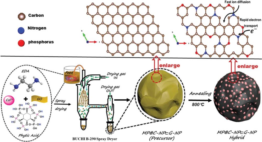 具有精确控制工程的过渡金属磷化物(TMP)材料的微/纳米结构调控的新型合成方法的发展对于实现其在电池中的实际应用至关重要。本研究采用喷雾干燥技术构建了三维(3D)N,P 共掺杂石墨烯(G-NP)微球,微球内嵌 CoP@C 和 MoP@C 两种核-壳型纳米粒子(CoP@C ⊂ G-NP, MoP@C ⊂ G-NP)。