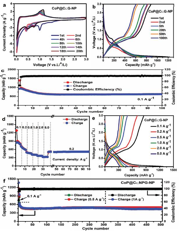 因此,CoP@C ⊂ G-NP 和 MoP@C ⊂ G-NP 复合材料在 0.1 A g-1 的电流密度下具有 823.6 和 602.9 mAh g-1 的高比容量;在 1 A g-1 下,500 次和 800 次循环后,比容量为 438 和 301mAh g-1,表现出及其出色的循环稳定性。