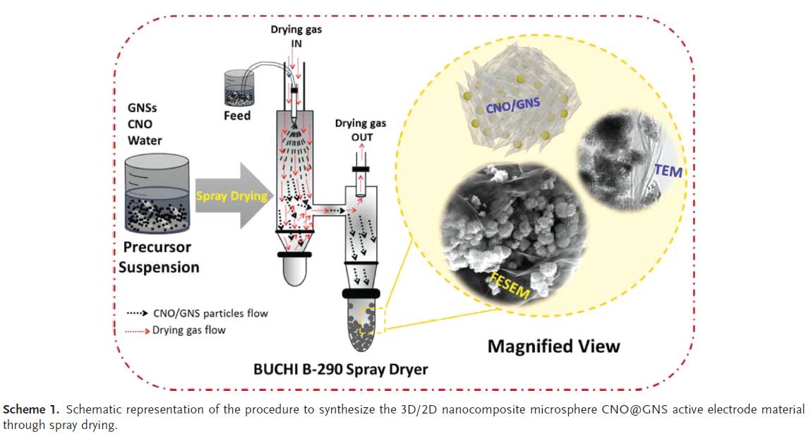 本研究开发了剥离石墨烯包裹的介孔氧化铜镍(CNO)纳米复合材料,采用快速喷雾干燥技术,通过石墨烯纳米片(GNSs)均匀包裹了分层介孔 CNO 纳米砌块,其协同效应有效地保护了电活性物质免受充放电过程引起的体积变化影响。由于脱落的石墨烯片的笼化效应产生的有趣结构和形态特征,这些 3D/2D CNO@GNS 纳米复合微球有望作为高性能锂离子电池的负极材料。
