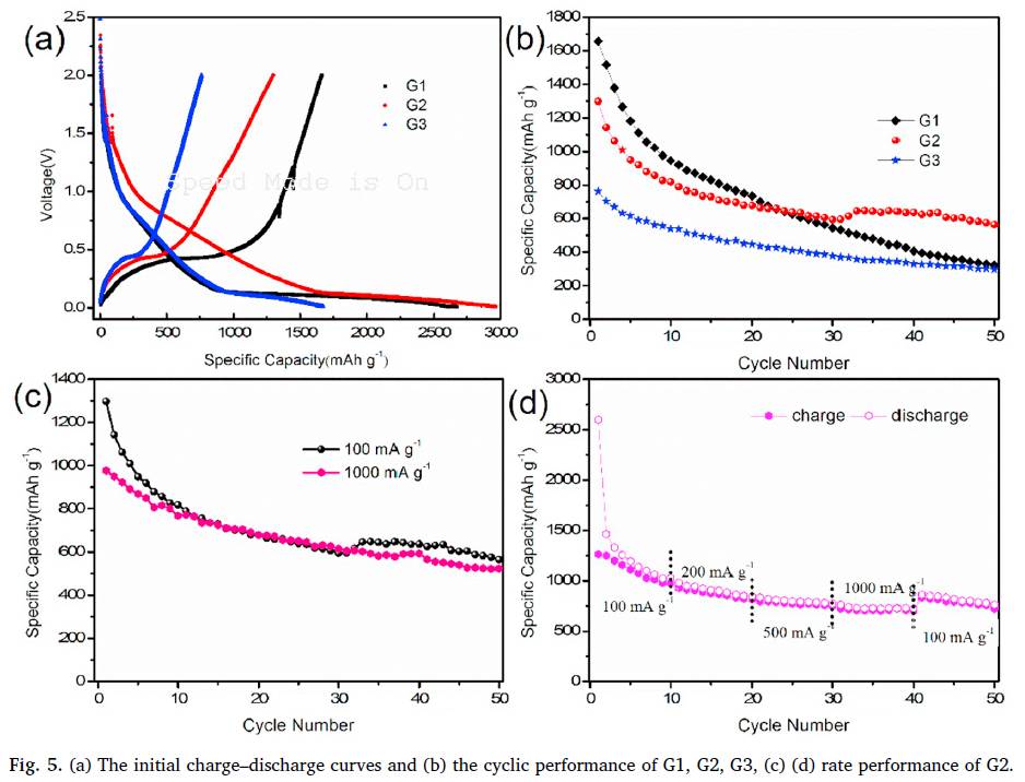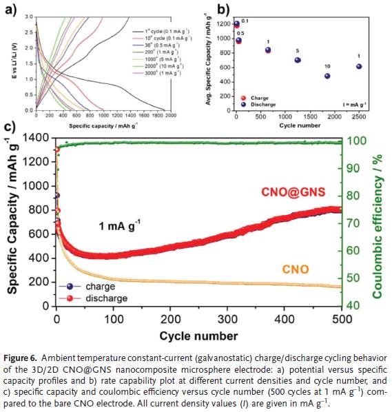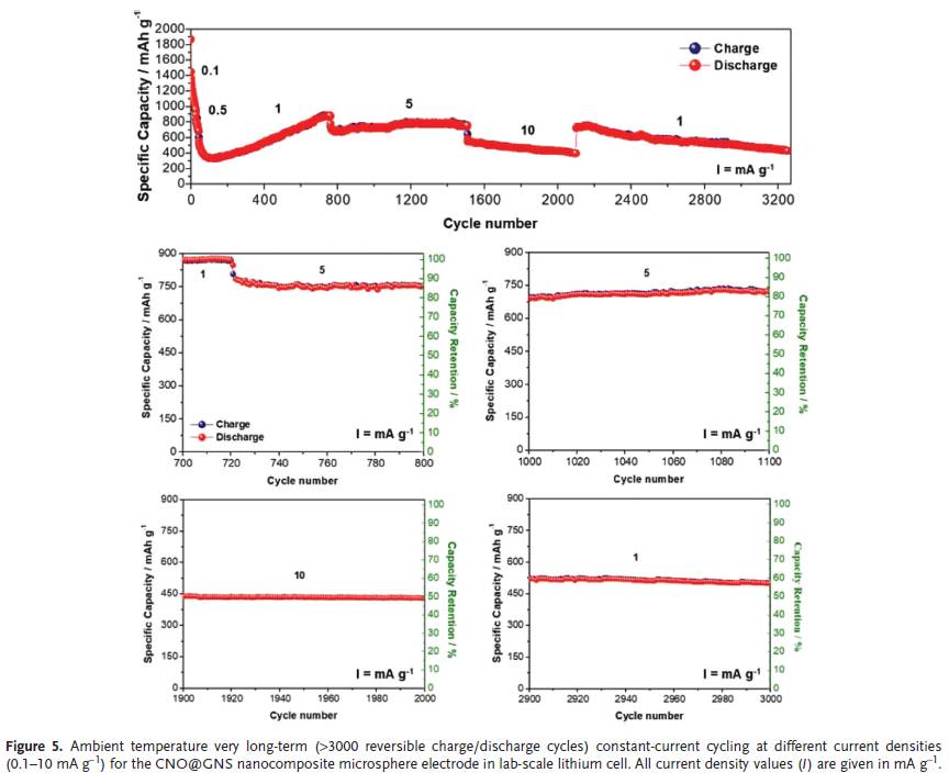 它们表现出前所未有的电化学行为,如高可逆比容量(在低 0.1 mA g-1 下的初始放电容量超过 1700 mAh g-1; 在 1 和 5 mA g-1 下,800 次和 1300 次循环后,比容量为 850 和 730 mAh g-1;在超过 2000 次循环 10 mA g-1 的非常高的电流密度下,比容量仍高于 400 mAh g-1),出色的库伦效率和长期稳定性(超过 3000 次循环,容量保持率>55%)。与通过传统技术制备的大多数过渡金属氧化物和纳米复合材料相比,其在高电流密度下是显著的。