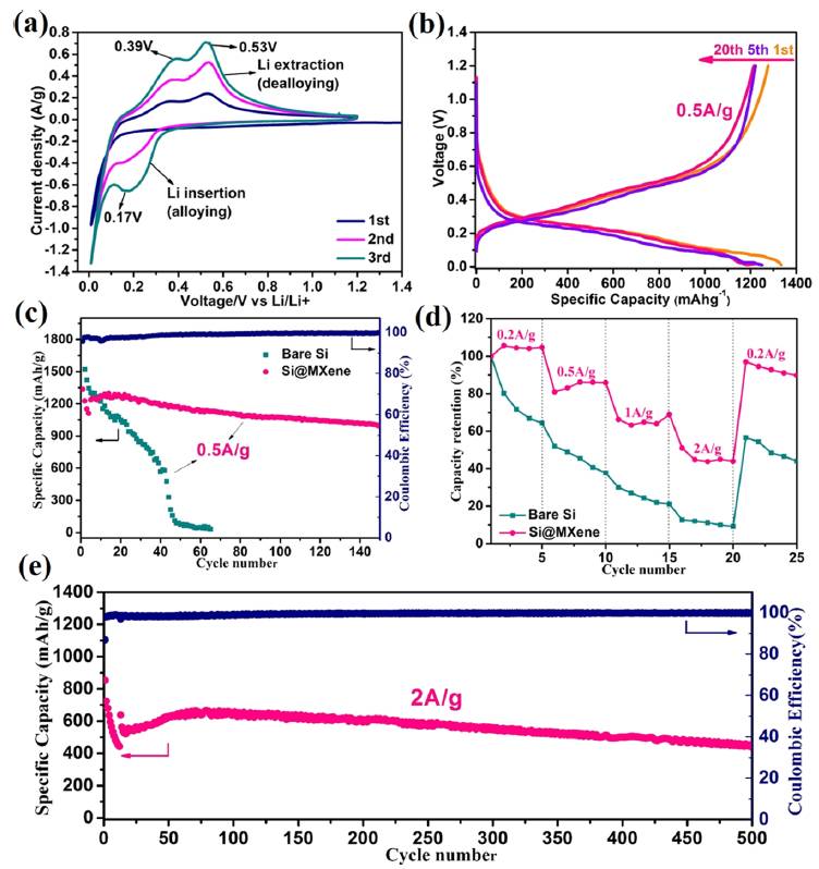 这两个因素都稳定了电极结构。此外,在充放电循环时, MXene 纳米片上丰富的氟/F封端基团有助于在框架外原位形成高度紧凑、耐用且机械坚固的富含 LiF 的电解质界面(SEI)层,这不仅抑制了 Si 和有机电解质之间的副反应,还增强了 MXene 框架的结构稳定性。