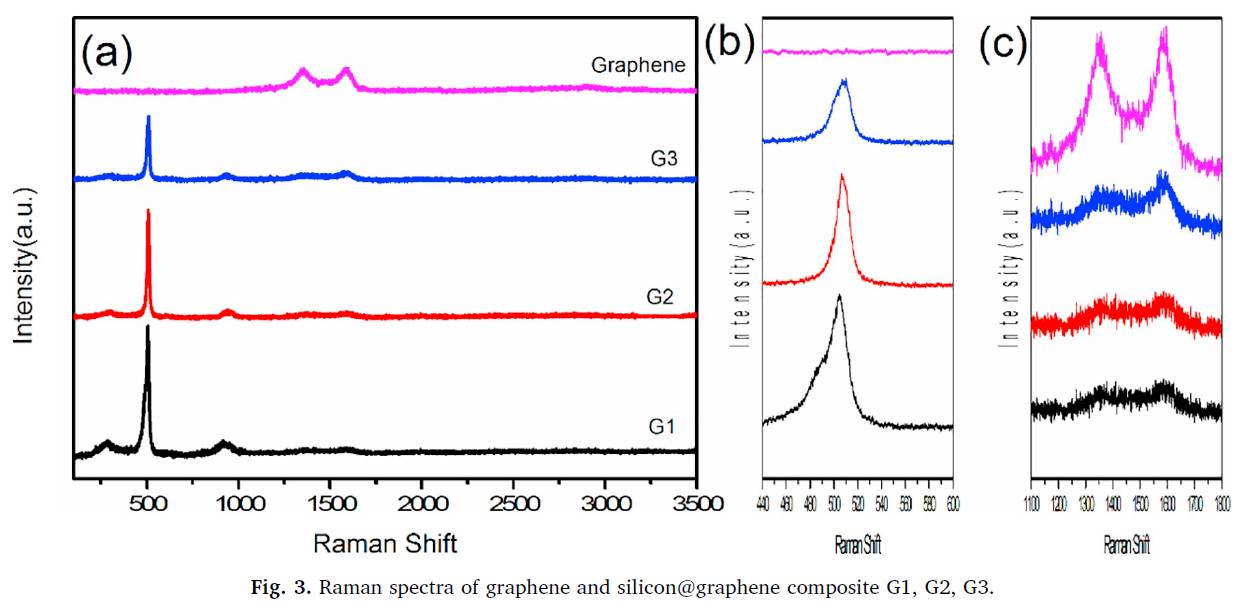 本文采用喷雾干燥法(进、出口温度分别为 160℃ 和 110℃)结合低温还原技术制备了硅@石墨烯复合材料作为负极材料。通过改进的 Hummers 方法合成了氧化石墨烯材料,并超声波处理将氧化石墨烯粉末分散到 5% 的乙醇溶液中。并在剧烈搅拌下将纳米硅粉末均匀地分散到氧化石墨烯悬浮液中形成硅@石墨烯复合材料。XRD 结果表明复合材料由硅和石墨烯组成,并经 FT-IR 和拉曼光谱验证。