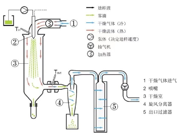 喷雾干燥是物料干燥和粉体制备的常用方法。液体浆料在喷嘴处雾化成极细的雾滴,极大增加了水分表面积,细小雾滴与热空气接触过程中水分迅速汽化,使物料中固体物质干燥成粉末,即得到干燥产品。使用实验级别喷雾干燥仪,一般液滴干燥成粉末仅需要几秒钟的时间;并且能直接使溶液、乳浊液、分散液干燥成粉状或颗粒状制品,可省去蒸发、粉碎等工序。