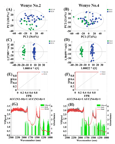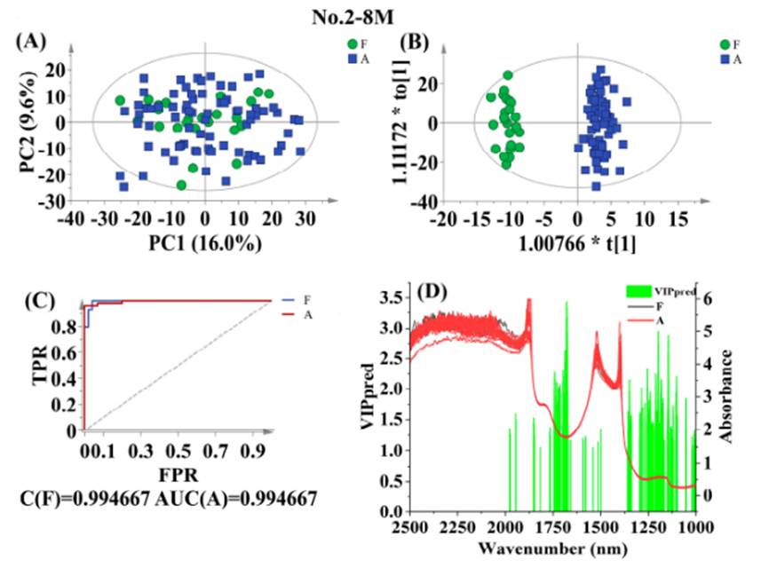 实验将存储在 7 天以内的样品定为新鲜的F级,将存储超过两周的样品定为久放的A级,将每天的 5 个随机选取的 2 号 8 个月和 4 号 8 个月中的 3 个样品,以及每天 3 个随机选取的 2 号 10 个月和 4 号 6 个月中的 2 个样品分到校正集,剩余样品分到验证集。通过 PCA 在 95 % 的置信区间下用霍特林统计量 T2 去除建模集中的异常样品。最终各集合中样品数量如下表: