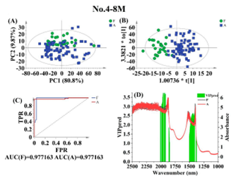 从以上结果不难看出,对椰子水的存储时间、品种和成熟度的定性鉴别都取得了比较理想的结果,除了文椰 2 号 8 个月和文椰 4 号 8 个月的存储时间判断中分别有 3 个和 2 个误判,其模型的总体识别率在 95% 和 97%,剩余的应用模型都达到了 100% 的识别水平。近红外光谱分析在椰子水定性方面展现了十分优异的结果,同时也在水果的快速定性这一应用领域显露出巨大的潜力。
