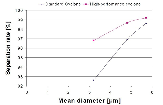 ▲ 图4.两种旋风分离器对喷雾干燥铵盐的分离率的影响