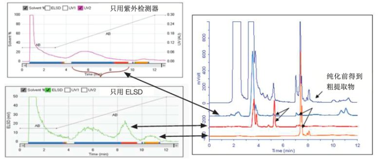 ▲ 图 3. 通过对照发现只用 UV 检测器对样品进行纯化,不能检测非发色团的产物,导致馏分纯度不高。使用 ELSD 检测器收集的馏分可分离出高回收率和高纯度的组分。