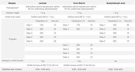 湿法灰化系统通过两种仪器的完美同步工作,得到最准确的结果。在这项研究中,通过对一些样品测试,如乳糖,玉米淀粉以及阿司匹林等。通过应用这些方法,测定的硫酸盐灰分含量低至 0.02 - 0.04 wt% (如表1),很好的吻合于样品的真值。