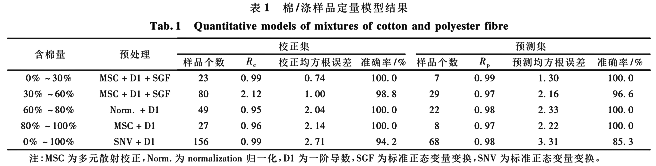 表1 中给出对棉/涤样品所建立的 5 个模型的汇总结果。以按照 GB / T 2910. 11-2009 方法测定的样品棉含量和模型预测棉含量的绝对 误差为判定依据,若绝对误差位于(-3%-3% ) 区间,认为样品预测准确,反之,预测错误。对棉含量为 0~100% 的模型进行优化后,校正集和预测集的相关系数 Rc 和 Rp 虽然较高,但校正均方根误差及预测均方根误差( RMSEP) 较大,且对样品的判定准确率低,预测集的准确率仅达 85.3% ,分段建模后预测准确率得到大大提高,可见,按棉含量不同分段建模,能更好地利用此含量范围内样品的特征,得到更好的效果。