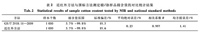 表2 示出近红外光谱法和国标方法 1000 个棉/涤验证样品棉含量的对比统计结果。1000 个棉/涤样品的预测结果为错判 10 个准确率为 99%。对预测结果和国标方法得到的结果进行方差分析,置信区间为 95%,显著性水平取 5%,F 比为 1.01,小于临界值 1.26,因此 2 种方法的结果无显著差异。