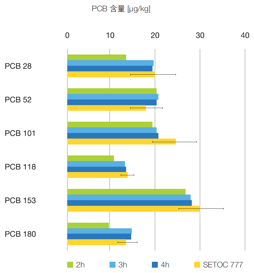▲ 图5: 提取 2h、3h 和 4h 后 PCBs 的回收率,误差条表示 SETOC 样品测定值的可接受误差范围(+/-标准差).