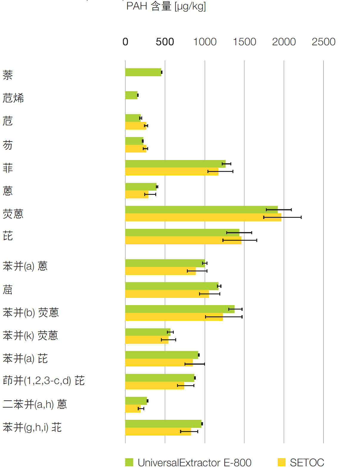 ▲ 图6: 用全频固液萃取仪 E-800 测定沉积物样品中多环芳烃的含量。误差条表示 SETOC 样本的标准 s 值的可接受范围(+/-标准差)