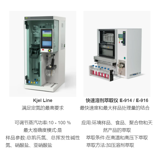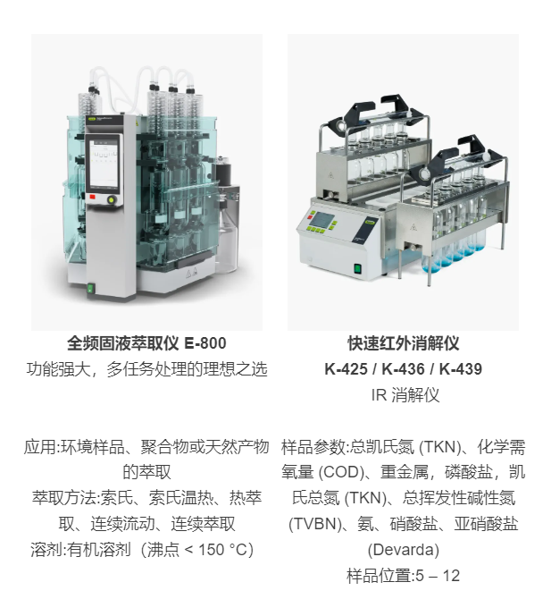 BUCHI 针对环境样品提供了一个完整的前处理解决方案。即使对于复杂及较难分析的样品,也能实现快速高效率的提取,保证了较高的回收率和较低的结果偏差。