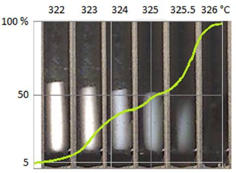 ▲ 图1 所示。聚四氟乙烯的熔化过程。绿色曲线表示熔点软件 Melting Point Monitor1.2 记录的相应熔化等级。熔点范围为 322.9±0.4°C ~ 326.0±0.1°C。
