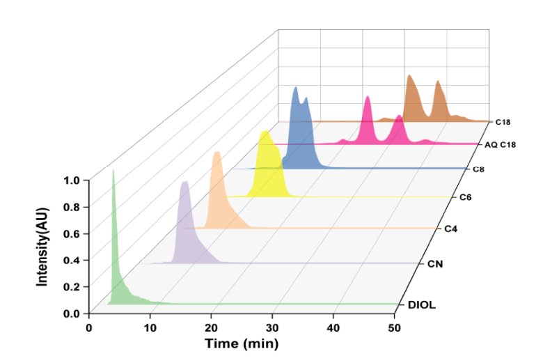 色谱柱填料是色谱系统的“核心”,其物理化学性质,包括包装结构的均匀性(单相、多孔或非多孔)、几何形状(粒径、床面积和孔径及形状)以及所附接的配体类型,对分离效能有显著影响。为了寻找高通量、低背压、高灵敏度和高分辨率以实现高效分离的色谱柱填料,对多种键合相材料(CN、Diol、C4、C6、C8、C18 和 AQ-C18)在 ω-3 脂肪酸乙酯的纯化中进行了评估(见 图1 和 表1)