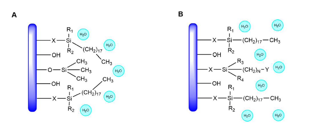 ▲ 图2. RP-MPLC 固定相(A) C18 和(B) AQ-C18 的结构差异