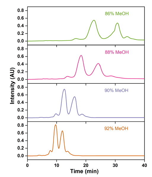 ▲ 图4. 不同甲醇浓度的 RP-MPLC 的 ω-3 脂肪酸乙酯色谱图
