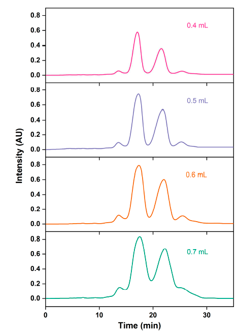▲ 图5. 不同上样体积 RP-MPLC 的 ω-3 脂肪酸乙酯色谱图