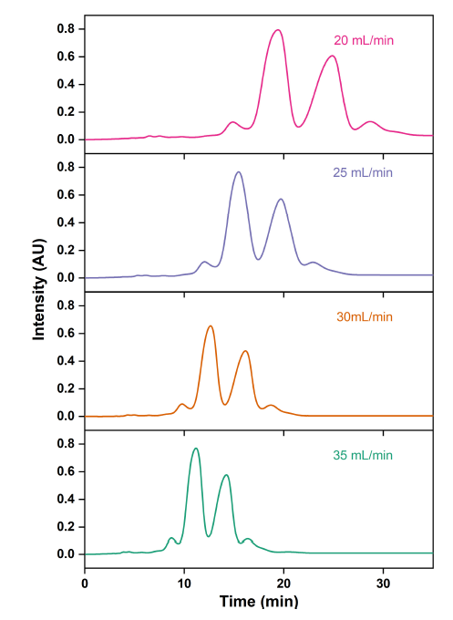 ▲ 图7. 不同流速下 RP-MPLC 的 ω-3 脂肪酸乙酯色谱图