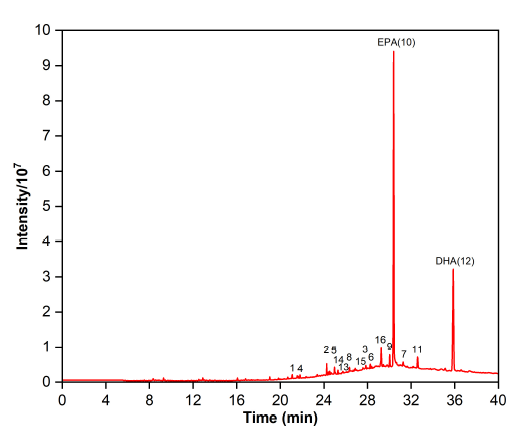 含有相当于色谱柱体积 1.25% 的鱼油乙酯被引入装有AQ-C18 填料的 RP-MPLC 柱(粒径 20-40 微米,孔径100Å,表面积 320−340m2/g),并用 90:10(体积比)的甲醇-水溶液作为等度流洗脱剂,流速为30mL/min,操作压力为 1-4bar,步琦 Pure Flash C-815 中压制备色谱。在最佳纯化条件下,鱼油乙酯的 RP-MPLC 色谱图如图8所示。收集了 B 和 C 两个馏分,并在减压下浓缩,随后通过 GC-MS 进行鉴定。总共鉴定出16种脂肪酸,以 2.39% 的单不饱和脂肪酸(SFA)、3.14% 的多不饱和脂肪酸(MUFA)和94.47% 的饱和脂肪酸(PUFA)的形式存在(图9和表7)。与初始样品相比,去除了 SFA C14:0、C15:0 和 C19:0;MUFA C24:1n9;以及PUFA C22:5n3、C20:3n6和C22:5n6。ω-3 PUFA 的比例从 78.59%上升到 90.34%,主要成分是 EPA 和 DHA,分别占 57.13% 和 28.14%,总计 85.27%。因此,通过 AQ-C18 RP-MPLC 纯化的 ω-3 脂肪酸乙酯符合《2020 年药典》中“乙基多烯酸”的标准,该标准规定 EPA 和 DHA 的含量至少为 84%。