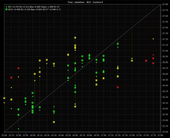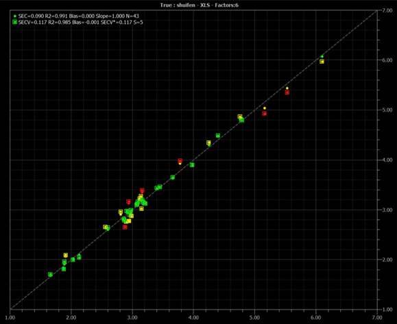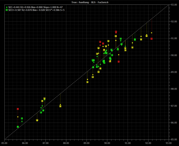 分别准备山梨醇样品 60 个和古龙酸样品 59 个,已知山梨醇样品水分和古龙酸样品中水分和古龙酸含量,并用 BUCHI ProxiMate 测量上述样品的近红外光谱,随后使用软件 AutoCal 自动建模,所得模型如下: