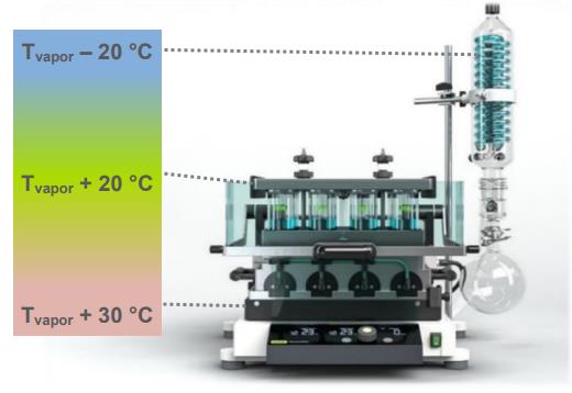 样品的传热对于蒸发和冷凝至关重要,从加热底座安装到样品架中的溶剂的传热以及从冷凝器中的蒸汽到冷却介质的传热。SyncorePlus 加热温度应设置比所使用的溶剂的沸点高 30℃ 以上,为防止溶剂蒸汽在真空盖板冷凝,因此设置真空盖板温度为 20℃ 以上。冷却循环水机设置温度比溶剂沸点低 20℃。为了改善加热架与样品管之间的传热,添加适当蒸馏水到内部的刻度线。