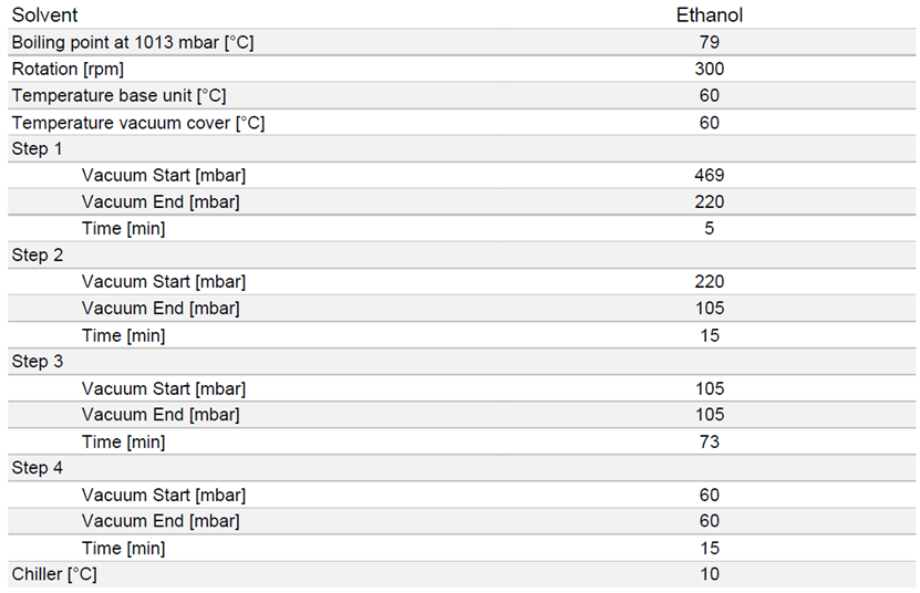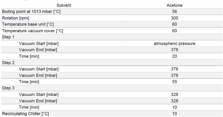 表1 和 表2 展示了使用 SyncorePlus R-24 分析架对丙酮和乙醇进行蒸发时的优化设置。使用 SyncorePlus 分析架 R- 24 对丙酮进行蒸发的方法包括三个步骤。第三步是确保残留溶剂定量至标定的体积。