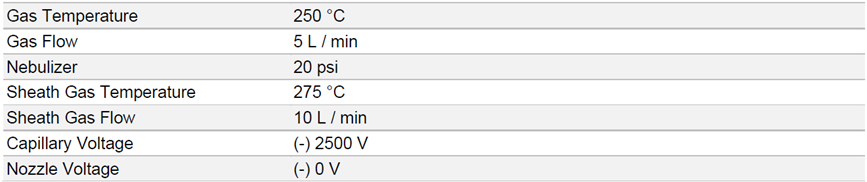 表3:通过 LC-MS/MS -MS/MS 进行定量 - 源参数。对于 dMRM 离子转换和大约的保留时间,见方法 1633 。