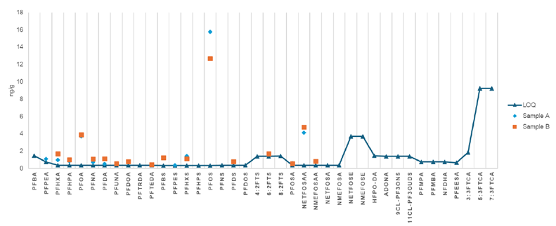 ▲ 图 3:LLOPR 样本中全氟和多氟烷基物质(PFAS)的测定