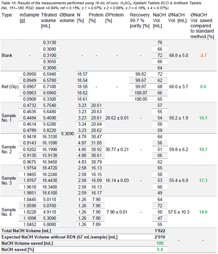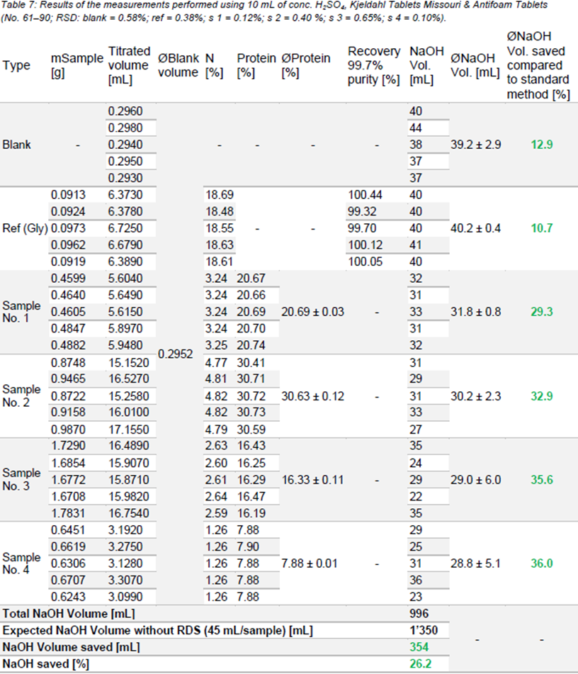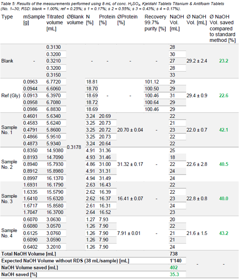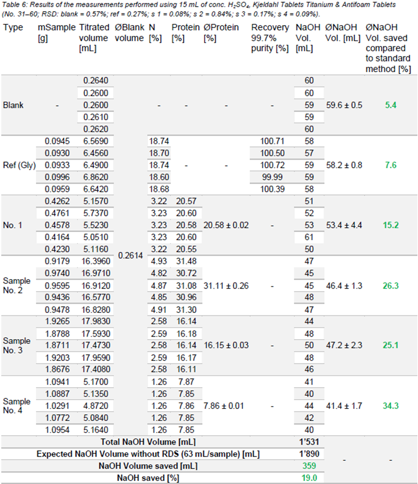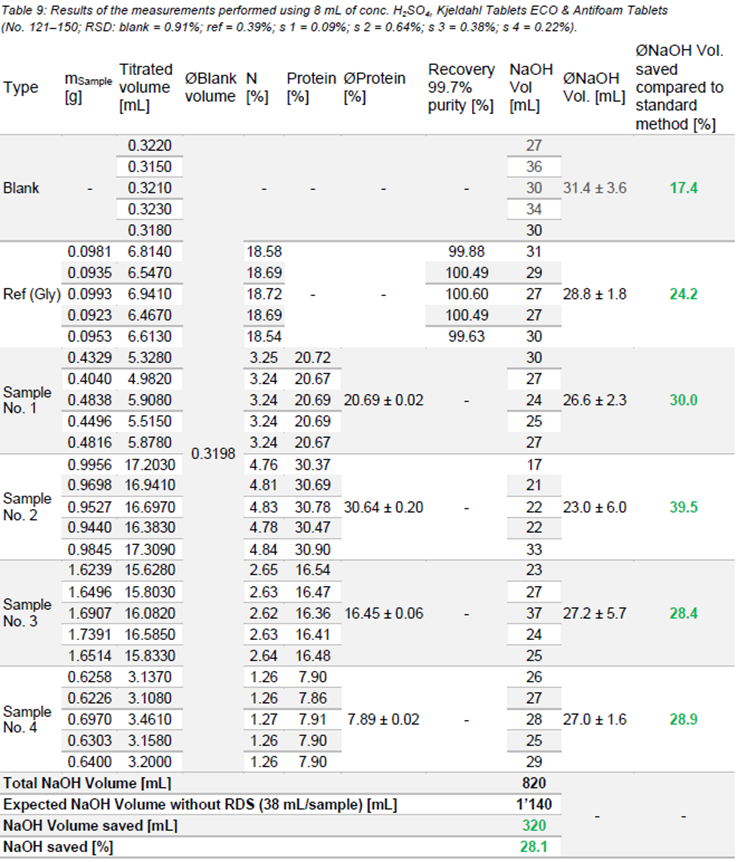 使用不同类型的凯氏定氮片消化样品的结果。空白(要求< 5%)和样品(要求< 1%)的相对标准偏差(RSD)良好。此外,参考样品的回收率在要求范围内(98.0 ~ 102.0%),测定的蛋白质含量与期望值非常接近。与标准方法相比,在第一次测量时,每个样品的NaOH最多可节省43.0%。
