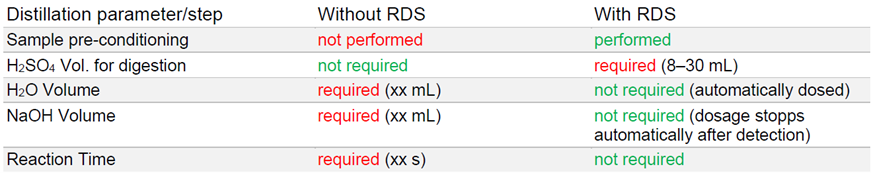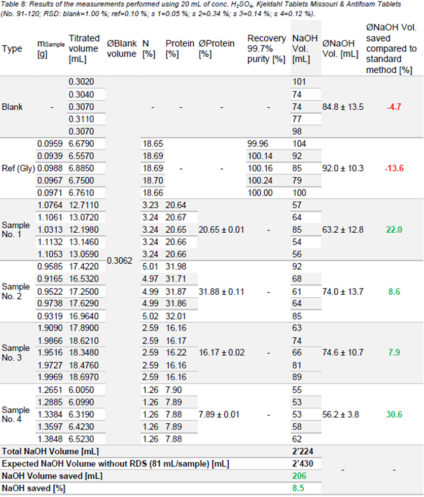 由于采用了 RDS 技术,在所有测量系列中都节省了氢氧化钠溶液。对于用步琦凯氏定氮钛片消化的样品,RDS 表现最佳,每份样品平均可节省高达 43.2%的氢氧化钠,且碱化终点的检测非常可重复。在消化时硫酸用量较低(例如 8 或 10 mL)的情况下,所有测量中都节省了氢氧化钠。此外,对于含有机物量大、消化过程中消耗大量硫酸的样品,氢氧化钠的消耗量也显著降低。