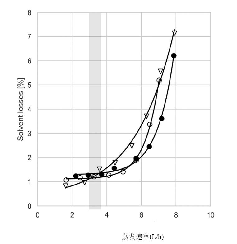 人们还应该注意到,在设备的极限上使用并不总是明智的。为了高效、温和和环保的蒸馏,建议根据 Delta 20 规则选择工艺参数[3]。对于给定的示例蒸馏,与这些参数对应的区域在 图2 中用灰色条表示。在该区域,所有冷凝器的性能都低于 2% 的溶剂损失阈值,并且只使用了可用冷却表面的一小部分。