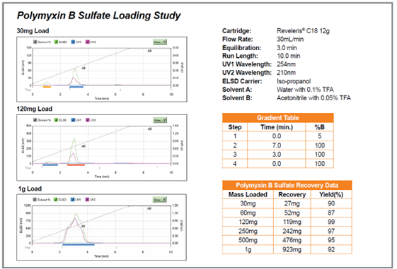 ▲ Polymyxin B 的快速纯化载样数据表明,上样量可达分离柱质量的 0.1–10%,而对回收率没有不利影响。