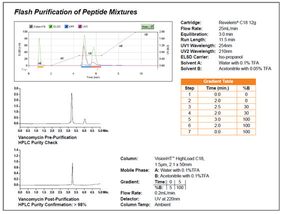 包含两个多肽(万古霉素和硫酸多粘菌素B)和一个小氨基酸(牛磺酸)的测试混合物证明了 Pure 快速纯化系统能够充分分离肽混合物的能力。结果表明,使用 60Å,40μm C18 介质进行快速纯化可充分分离出三种具有对称峰形的化合物。UHPLC证实了万古霉素和硫酸多粘菌素B的纯度均高于 98%。混合物在10分钟内纯化,这比使用制备型 HPLC 纯化相同混合物快约4倍。除此之外,结合了 UV 和 ELSD 双检测器系统的另一个好处是,可以检测和收集未反应的氨基酸片段和无紫外吸收产物。以此为例,牛磺酸仅被 ELSD 检测到。