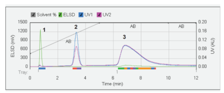 实验结果表明,传统快速色谱系统对非发色团化合物的分离和检测效果不佳,而 Pure C-815 系统凭借其先进的 ELSD 检测技术,能够在纯化过程中精准识别并分离反应混合物中的非发色团化合物(1)。这一技术突破显著提升了样品的回收率,为后续的药物分析和研发提供了更纯净、更可靠的样品。