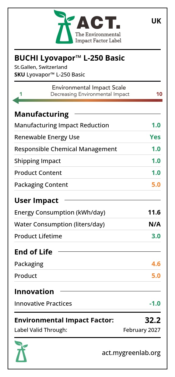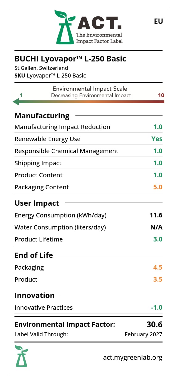 评估实验室产品和仪器的可持续性需要获得全面的环境影响数据。实验室和采购经理必须有足够的信息来评估产品的可持续性。为了与持续改进和环境责任的承诺保持一致,BUCHI 加入了 ACT 标签计划,这是由非营利组织“我的绿色实验室”发起的认证计划。