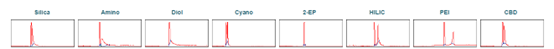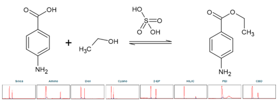▲ 图7. 上:苯佐卡因合成反应方程,下:筛选结果Sepmatix 8x SFC;从左到右依次为:硅胶、氨基、二醇、氰基、2-EP、HILIC、PEI和CBD;运行时间= 15分钟。