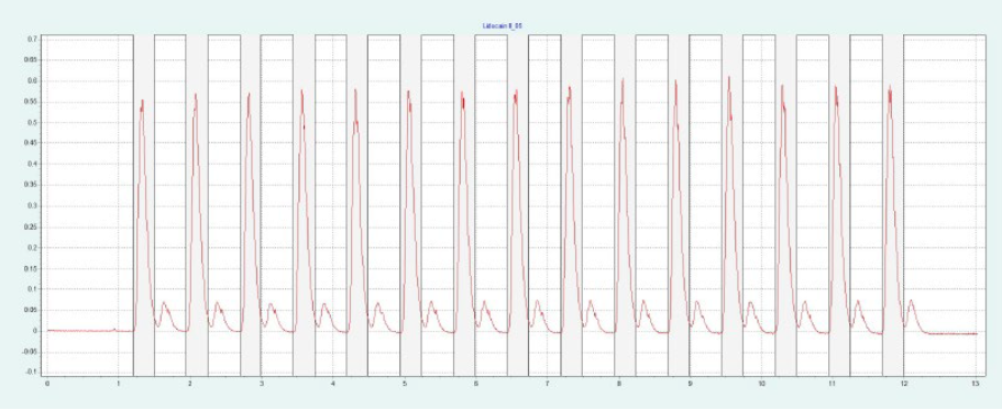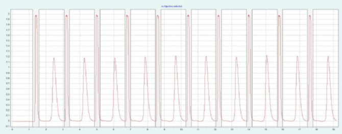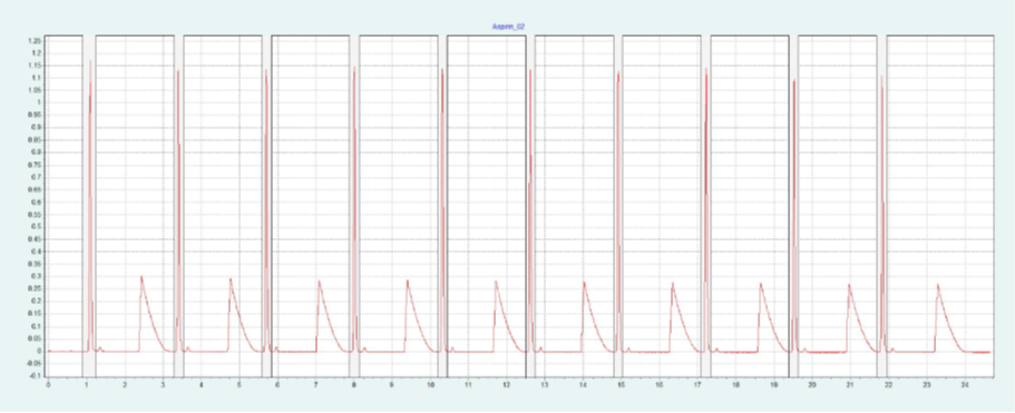 选择 2-EP 相进行制备纯化。筛选结果表明,改性剂含量约为 26-40% 时,ASA 和 SA 可被洗脱。图6(上)为改性剂含量为 40% 时,ASA 在 2-EP 制备柱上的纯化结果。在改性剂中加入 0.5% 甲酸,改善 SA 的峰形。SA 在没有甲酸的情况下显示出很强的尾砂。随着甲酸的加入,SA 的尾砂峰值降低。在相同条件下,可以采用叠层进样法对 ASA 进行自动化纯化(见下图6)。因为只有 ASA 是相关的,所以不收集 SA 和其他杂质。